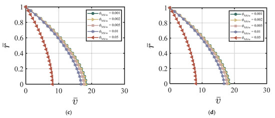 Effect of of the combined NS FA-added cement suspension on velocity at (a) cycle #2; (b) cycle #10; (c) cycle #50; (d) cycle #200 with , k = 6.5, , , , , χ = 3.15, ζ = 1, m = 0.5, Re = 100, P = 10, = 0, κ = 0.001.