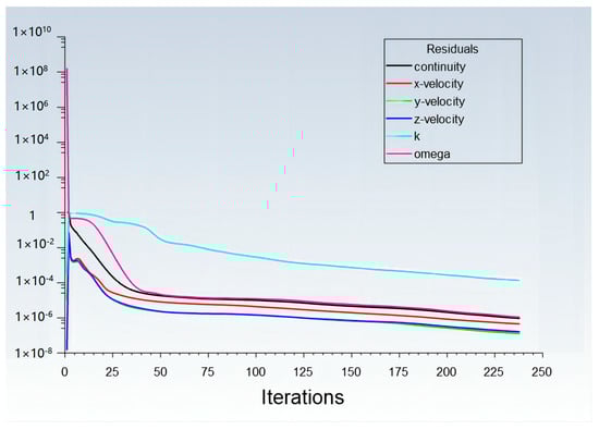 The simulation was carried out by Fluent software (Version 2021R3) with its MRF (Multiple Reference Frame) models, and the simulation was set to be in a steady state. The transient simulation with SMM (Sliding Mesh Model) could also be carried out with the same geometry and meshes. But due to the fact that it was easy to converge with the steady-state results as its initial conditions, the transient simulation took too much time to finish a single calculation test for more than several days, and the transient simulation showed little difference in the physical data, which we were concerned about based on the steady-state simulation. As a result, the steady-state simulation with the MRF model became the first choice in this study. The turbulence model was chosen as the k-ω SST model, with room temperature air as the fluid material. Because of the significant number of mesh elements, the convergence of this model was a big problem at the beginning of the project. After several adjustments, the double precision option in Fluent needed to be opened even if it would cost massive memory usage. The algorithm options are shown in Table 4. As a result, the simulation could always be stably convergent with a residual error of less than 10−4 in fewer than 500 steps with a steady state. The convergence step depended on the structures of the card clothing, varying between 150 and 500. Figure 5 shows the typical convergence curves of a single test.