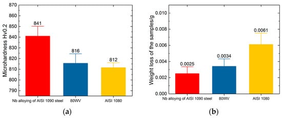 The hardness test results showed a noticeable improvement in the new steel, with at least 20 Hv0.2. As a result, the wear resistance of Nb alloying of AISI 1090 steel was also improved by about 25% compared with 80 WV, which showed less weight loss in the wear test lasting about 9 h, with five examples for each material (Figure 8). The 80 WV always had a grain grade of 13 with suitable heat treatment because of the micro alloyed vanadium and tungsten, so the wear resistance increased a lot compared with carbon steel without alloyed elements like AISI 1080. The Nb alloying of AISI 1090 steel had a slightly smaller grain size and a higher hardness, so the wear resistance was also improved. These results show that a suggestion to improve the wear resistance of steel for card clothing is that a higher hardness and a finer grain size could be a better choice for the mechanism of wearability with high strength and toughness.