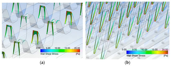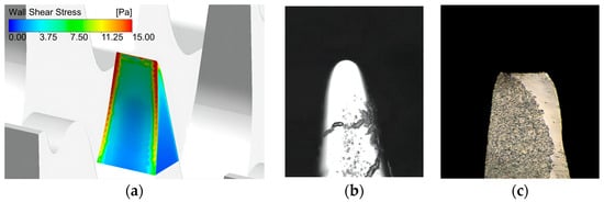 This study selected wall shear stress as the physical quantity to describe the hold force of the carding elements, an indistinct experienced concept. The reason was that the wall shear stress had the same distribution as the wear on the surface of the containers in some references [24]. The wall shear stress distribution on card clothing seemed similar to the wear distribution (Figure 9), and the wall shear stress implied the carding position and changes in carding position in the simulation analysis. The higher the contact friction force between the fibers and tooth surface, the higher the loss of tooth tips because of the wear. This way, wall shear stress can be selected to act as a physical indicator to describe the holding force in the carding process.