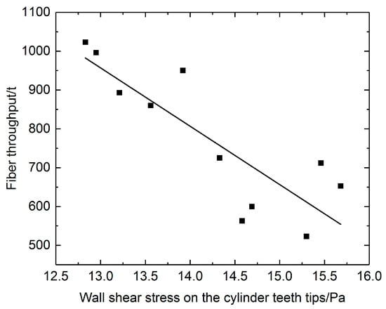 Figure 11 shows an approximate anticorrelation between the average wall shear stress and the fiber throughput. After gathering the information from several spinning mills producing similar cotton yarn with similar raw material and the same yarn-forming process, the average wall shear stress calculated from the simulation showed an approximate anticorrelation between the life span of the card clothing measured by the fiber throughput. The higher the wall shear stress was, the lower the life span the card clothing could acquire. However, the quantity relationship was never built because too many factors could have an impact on the life span of card clothing. This anti-relationship is just a glance at the wear mechanism in the carding process. Still, the dominant role of soft materials in the shear stress of hard materials provides theoretical support for this. In the article, the wall shear stress was considered the holding force of the teeth tips, and it was also an essential factor that influenced the carding performance. In general, a higher carding force could yield better carding performance. It was interesting to find that the life span of the card clothing and the carding performance were contradictory, and this is a common phenomenon in most industrial processes.