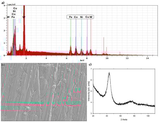 A quinternary WFeCoNiCu alloy has been successfully synthesized utilizing the electrodeposition process. The morphology and crystalline structure of the alloy were shown to be comparable with previously researched binary and ternary tungsten alloys, especially the ternary alloys of tungsten, an iron-group metal and copper [25]. The novel quinternary alloy appears to be a homogeneous nanocrystalline material, close to amorphous. The XRD pattern (Figure 1c) proves that the WFeCoNiCu alloy contains no inclusions of other systems, such as metal oxides or solid solution phases of non-tungsten alloys. The issue of homogeneity of the electrodeposited tungsten alloys was already covered more exhaustively in our previous studies [27,28].