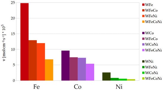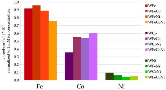 The results from Table 4 and Table 5 are presented below as bar charts in Figure 2 and Figure 3. Figure 2 is a straight representation of the values of v for the Fe, Co and Ni deposition in particular binary, ternary and quaternary alloys. The values of the deposition rates, as given in Figure 2, are easily comparable visually within the categories of binary, ternary or quaternary alloys. However, as already mentioned, the particular inducing metal ion concentrations for the ternary metal deposition were divided by half, so the constant 27 mM concentration is shared by the two inducing metal ions in the bath, and so on with the bath for the quaternary alloy and three inducing metal ions. Thus, Figure 3 is presented as well, where the rates have been normalized to 1 mM metal ion concentrations, that is, divided by 27 for the binary alloys, by 13.5 for the ternary alloys and by 9 for the quaternary WFeCoNi alloy deposition. Presented in such a way, the differences between the values of the deposition rates can be compared for the particular inducing metals, especially in terms of divergencies from the linearity of v as a function of the metal ion concentration.