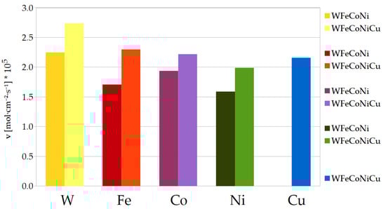 For each metal X (Fe, Co, Ni or Cu), the deposition rate [mol · cm−2 · s−1] calculated for a particular sample v is X = Δm · wt%X · A−1 · M−1 · t−1, assuming that the electrodeposition process is not affected by changing A or t. The final results, i.e., the values of the v of the inducing metals, at% of tungsten and other metals, and CE of the whole process, were calculated as an average within the four mentioned bath series. All the following values of v have been multiplied by 105 for legibility of the data.