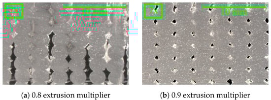 The value of the extrusion rate is very specific to the extruder being used, whereas the extrusion multiplier (EM) is a unitless ratio of the expected bead width and tool path-informed bead width [43]. For example, with an EM of 1.1, the expected bead width is 1.1 times larger than the tool path allotted for the given bead. While each printer–extruder–material system may require a unique EM for geometric fidelity, an EM of 1.0 would typically be used for a model-accurate print because the desired bead width would equal the expected bead width. For relatively low extrusion rates, the resultant bead geometry is expected to have a bead–nozzle area ratio that is low for a given printer. Comparatively, for relatively high extrusion rates, the resultant bead area is often larger than the area of the nozzle. This is visualized in Figure 2.