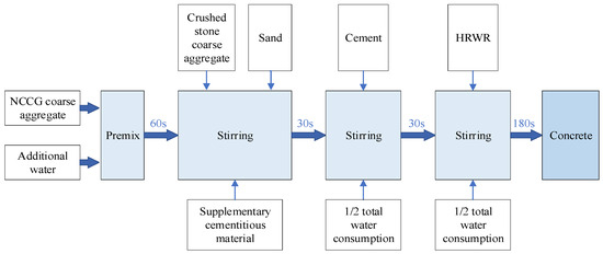 The preparation process of NCCG coarse-aggregate high-performance concrete is shown in Figure 2. The coal gangue aggregate and additional water were mixed in a mixer for 60 s and stood for 5 min. Then, ordinary crushed stone, sand, and supplementary cementitious material were added and the mixture was stirred for 30 s; cement and 1/2 water consumption were added and the mixture was stirred for 30 s; and, finally, HRWR and 1/2 water consumption were added and the mixture was stirred for 180 s. Firstly, the slump and expansion of fresh concrete were tested, and then the fresh concrete was poured into the molds of 100 mm × 100 mm × 100 mm, 100 mm × 100 mm × 300 mm, and 100 mm × 100 mm × 400 mm. These were covered with plastic wrap and moved to a standard curing room (temperature = 20 ± 2 °C, relative humidity = 95 ± 1%) for 1 day before demolding. Then, samples were moved to the standard curing room for curing until the testing age.
