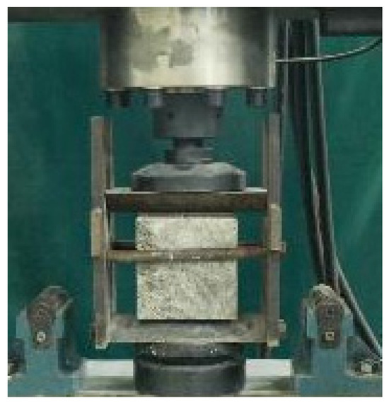 The sample size for compressive strength and splitting tensile strength testing is 100 mm × 100 mm × 100 mm, and the axial compressive strength is 100 mm × 100 mm × 300 mm. The WAW-1000 micro-controlled electro-hydraulic servo universal testing machine was used to test the samples. Three samples were tested in each group, and the average value of the three samples was taken as the final strength. The splitting tensile strength testing device is shown in Figure 3.