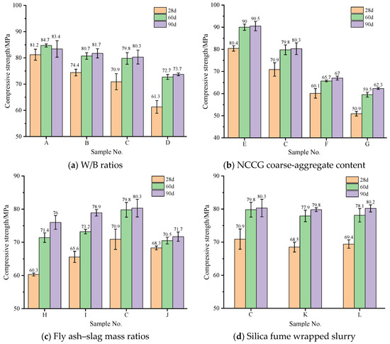 Figure 4 shows the compressive strength of NCCG coarse-aggregate high-performance concrete, and Figure 4a shows the W/B ratio factor. With the increase in the W/B ratios, the compressive strength of concrete decreased; in particular, the 28 d compressive strength is more significantly affected by the W/B ratios. Figure 4b shows the NCCG coarse-aggregate content factor. As the NCCG coarse-aggregate content increased, the compressive strength continuously decreased. The 28 d compressive strength of NCCG coarse-aggregate high-performance concrete with 0%, 30%, 45%, and 60% content was 80.4 MPa, 70.9 MPa, 60.1 MPa, and 50.9 MPa, respectively. It is obvious that the compressive strength decreases significantly with the increase in NCCG coarse-aggregate content (the compressive strength decreased by 11.82%, 25.25%, and 36.69% when the content was 30%, 45%, and 60%, respectively). This is mainly because the NCCG coarse aggregate itself has a high crushing value and lower strength. Figure 4c shows the fly ash–slag mass ratio factor. When more fly ash was added, the initial compressive strength was lower, and the later strength increased significantly with the increase in curing age. When the slag content was large, the initial strength was large, and the increase rate was slow in the later period. The compressive strength at 90 d is still higher than that of fly ash. Figure 4d shows the silica fume coating factor, which reduces the compressive strength of concrete. With the reduction in the water-silica fume ratio of silica fume coating, the compressive strength decreased. This is due to silica fume being adsorbed on the surface of NCCG coarse aggregate; although this can make the surface of NCCG coarse aggregate denser, it hinders the combination of other cementitious materials with NCCG and reduces the interface bonding force, resulting in a decrease in compressive strength.