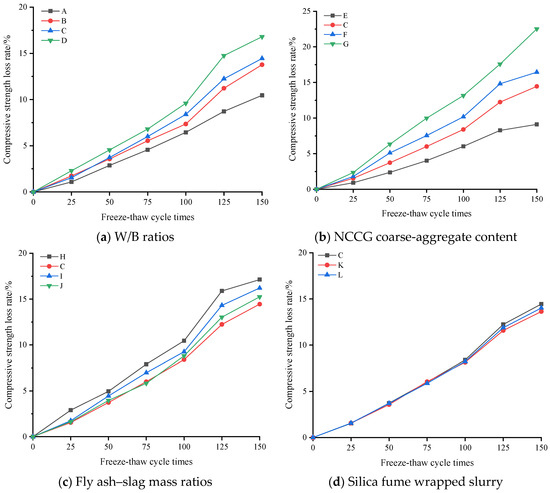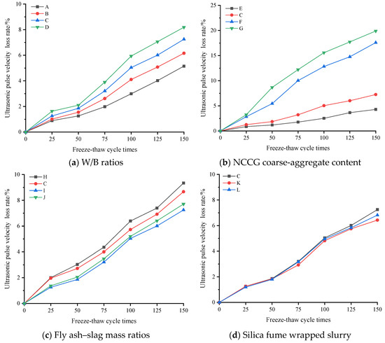 Due to the layered structure and large water absorption of coal gangue, relevant studies have found that the frost resistance of coal gangue coarse-aggregate concrete is poor [13]. Figure 7 shows the compressive strength loss rate of NCCG coarse-aggregate high-performance concrete after the freeze–thaw cycles. The compressive strength of all samples decreased with the increase in the number of freeze–thaw cycles. Figure 7a shows the W/B ratio factor. As the W/B ratio increased, the compressive strength loss rate increased. Figure 7b is the NCCG coarse-aggregate content factor. After 150 freeze–thaw cycles, the compressive strength loss rates of concrete with 0%, 30%, 45%, and 60% NCCG coarse-aggregate content were 9.11%, 14.45%, 16.44%, and 22.52%, respectively, and the compressive strength loss rates increased significantly. Figure 7c shows the fly ash–slag mass ratio factor. The concrete sample with only fly ash had the highest compressive strength loss rate (17.13%), and the compressive strength loss rate slightly improved after adding slag. Figure 7d shows the silica fume coating factor. Compared with non-silica-fume-coated concrete, the compressive strength loss rate of concrete with a water silica fume ratio of 0.80 and 0.55 reduced by 0.43% and 0.81%, respectively. Figure 8 shows the ultrasonic wave velocity loss rate of NCCG coarse-aggregate high-performance concrete after freeze–thaw cycles, showing a similar variation to that of the compressive strength loss rate. The NCCG coarse-aggregate content was the biggest influencing factor. After 150 freeze–thaw cycles, the ultrasonic wave velocity loss rates of NCCG coarse-aggregate content of 0%, 30%, 45%, and 60% were 4.29%, 7.25%, 17.58%, and 19.89%, respectively.