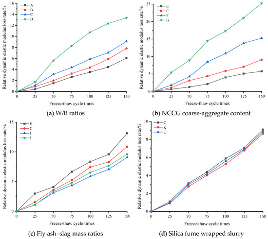 The relative dynamic elastic modulus loss rate of NCCG coarse-aggregate high-performance concrete after freeze–thaw cycles.