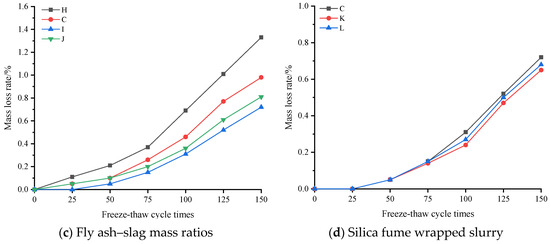 Figure 9 shows the relative dynamic elastic modulus loss rate of NCCG coarse-aggregate high-performance concrete after freeze–thaw cycles. Figure 9a shows the W/B ratio factor. The larger the W/B ratio, the more the relative dynamic elastic modulus loss, especially when the W/B ratio was 0.28, and the relative dynamic elastic modulus loss rate increased significantly. Figure 9b shows the NCCG coarse-aggregate content factor. The relative dynamic elastic modulus loss rate of concrete with 0%, 30%, 45%, and 60% NCCG coarse-aggregate content was 5.78%, 9.09%, 15.25%, and 25.25%, respectively. When the NCCG coarse-aggregate content exceeded 30%, the relative dynamic elastic modulus loss rate increased rapidly. Figure 9c shows the fly ash–slag mass ratio factor. When fly ash was added alone, the relative dynamic elastic modulus decreased the most, reaching 13.13%. When 30% slag was added alone, the relative dynamic elastic modulus decreased by 9.6%. When 10% fly ash and 20% slag were added, the decrease was the least, reaching 9.09%. This indicates that slag can improve the frost resistance of NCCG coarse-aggregate high-performance concrete more than fly ash. Figure 9d shows the silica fume coating factor, and the relative dynamic modulus loss rate of concrete with a water-silica fume ratio of 0.80 and 0.55 decreased by 0.23% and 0.45%, respectively. Figure 10 shows the mass loss rate of NCCG coarse-aggregate high-performance concrete after freeze–thaw cycles, which exhibited the same variation as compressive strength, ultrasonic wave velocity, and relative dynamic elastic modulus. The content of NCCG coarse aggregate had the greatest influence on the mass loss rate, followed by the W/B ratio.
