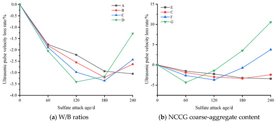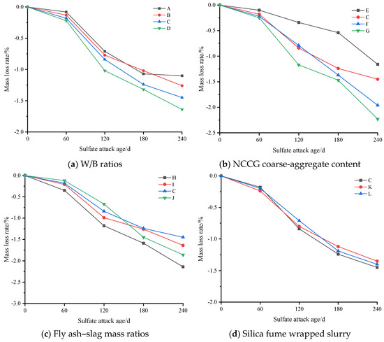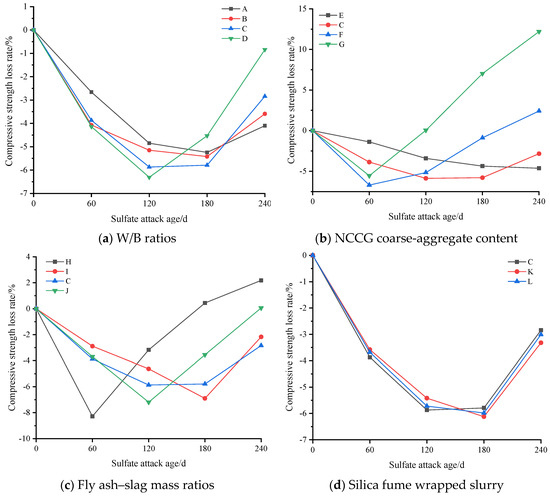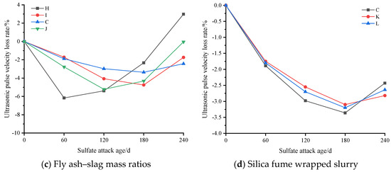 The evaluation indexes of sulfate resistance of NCCG coarse-aggregate concrete are compressive strength loss rate, ultrasonic wave velocity loss rate, and mass loss rate. Figure 11 shows the compressive strength loss rate of NCCG coarse-aggregate high-performance concrete after sulfate attack. Figure 11a shows the W/B ratio factor. With the increase in the W/B ratio, the growth rate of compressive strength at 120 d of sulfate attack increased. This is mainly because with a larger W/B ratio, Na2SO4 can more easily penetrate into the concrete, resulting in a large amount of ettringite and gypsum, and the increase in compressive strength is more obvious. After 120 d or 180 d of sulfate attack, the compressive strength began to decrease, which was mainly related to the production of expansive ettringite hydration products [21]. Figure 11b shows the NCCG coarse-aggregate content factor, and the four concrete groups show significant differences. When the NCCG coarse-aggregate content was 0%, the compressive strength of concrete after sulfate attack for 240 d still showed an increasing trend. When the NCCG coarse-aggregate content was 30%, the concrete under sulfate attack for 120 d had the highest compressive strength, and then the compressive strength decreased with the increase in attack age. When the NCCG coarse-aggregate content was 45% and 60%, the maximum compressive strength was obtained at 60 d of sulfate attack, and then the compressive strength decreased linearly with the increase in attack age. When NCCG coarse-aggregate content was 60%, the compressive strength loss rate of sulfate attack for 240 d was 12.19%. The main reason for this is that NCCG has a high crushing value, water absorption, and internal porosity, and its internal compactness is low; therefore, sodium sulfate will more easily penetrate into the concrete, and a large amount of ettringite generation causes a faster decline in compressive strength. Figure 11c shows the fly ash–slag mass ratio factor. Single-doped fly ash or slag showed poor resistance to sulfate attack, and the compressive strength decreased by 2.18% and 0.06%, respectively, after 240 d of sulfate attack. The sulfate resistance of composite fly ash–slag concrete was improved, mainly because the specific surface area and surface morphology of fly ash and slag are different, and the mixed use can fill the internal voids of concrete and enhance the compactness of concrete. Figure 11d shows the silica fume coating factor. When NCCG coarse aggregate was treated with silica fume paste coating, the change in sulfate resistance was not significant.