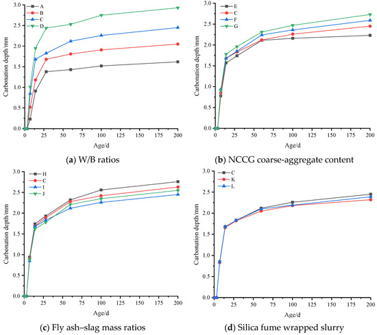 Figure 14 shows the carbonation depth of NCCG coarse-aggregate high-performance concrete. Overall, the carbonation depth increases with the increase in carbonation age. In the early stage of carbonation, the carbonation depth increases rapidly, while in the later stage, the carbonation depth increases slowly. Figure 14a shows the W/B ratio factor. As the W/B ratio increases, the carbonation depth increases. When the W/B ratios are 0.20, 0.22, 0.25, and 0.28, the carbonation depths of concrete after 200 d of carbonation are 1.62 mm, 2.05 mm, 2.45 mm, and 2.93 mm, respectively. The W/B ratio has the greatest effect on concrete carbonization, mainly because the larger the W/B ratio, the greater the number of internal pores in NCCG high-performance concrete, thereby providing more diffusion channels for CO2. With the increase in carbonization age, the internal compactness of NCCG coarse-aggregate high-performance concrete is high, and CO2 reacts with surface Ca(OH)2 to generate calcium carbonate, further hindering the invasion of CO2. After carbonization of 3 d, due to the dense cement mortar layer on the surface of the concrete, CO2 cannot enter, resulting in almost no carbonation depth being measured [22]. Figure 14b shows the NCG coarse-aggregate content factor. With the increase in the NCCG coarse-aggregate content, the carbonation depth of concrete increases. When the NCCG coarse-aggregate content was 60%, the carbonization depth of 200 d concrete was only 2.73 mm, showing excellent carbonization resistance. The NCCG coarse-aggregate content is not the most important factor affecting the carbonization resistance of concrete. In the early stage of carbonization, there is not much difference in the surface cement mortar layer of each group of samples, and CO2 enters the interior of the concrete at the same speed. In the later stage of carbonization, due to the layered structure of coal gangue aggregate, there are many micro-cracks and pores, which make it easier for carbon dioxide to diffuse inside the concrete and react with hydration products, resulting in a higher replacement rate of NCCG coarse aggregate and a greater carbonization depth.
