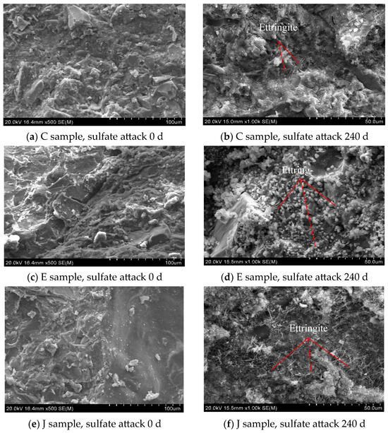 During the freeze–thaw cycles, the NCCG coarse-aggregate content is the main influencing factor. The concrete samples of Group C, H, J, and L with 0 and 150 freeze–thaw cycles were tested by SEM. Figure 15 shows an SEM photo of NCCG coarse-aggregate high-performance concrete after freeze–thaw cycles. It can be seen that after 150 freeze–thaw cycles, the ITZ of cement mortar and NCCG coarse aggregate have different degrees of damage. The layered structure of NCCG coarse aggregate and the cracks of the ITZ were obviously seen in Group C samples. There is no obvious stratification between NCCG coarse aggregate and mortar after silica-fume-coated paste (L sample) treatment; the crack width is also relatively small and the mortar far away from NCCG coarse aggregate has freeze–thaw cracks, that is, the silica fume coating improves the freeze-resistance of the ITZ. Figure 16 shows the SEM photo of NCCG coarse-aggregate high-performance concrete after sulfate attack. After 240 d of sulfate attack, needle rod and granular ettringite appear in the concrete. It can be clearly seen from Figure 16d,f that the surface of NCCG coarse aggregate is interwoven with a large amount of ettringite.