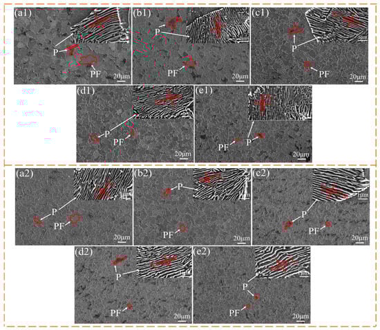 SEM of the microstructure of experimental steel at different cooling rates: (a1–e1) LN; (a2–e2) HN.