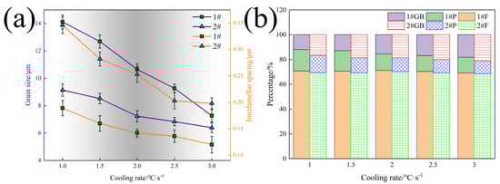 Microstructure statistics of experimental steels: (a) grain size and ILS; (b) microstructure statistics.
