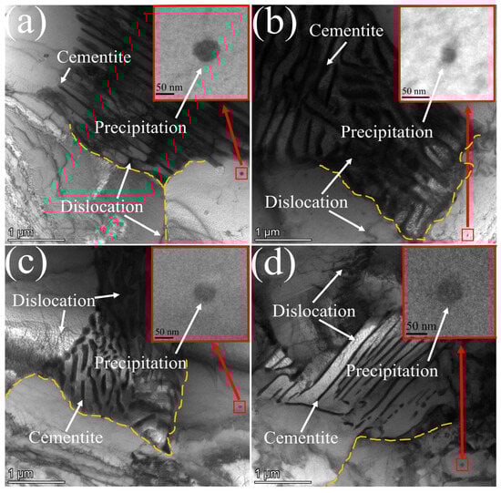 TEM of experimental steels with different cooling rates: (a) LN 1 °C·s−1; (b) LN 3 °C·s−1; (c) HN 1 °C·s−1; (d) HN 3 °C·s−1 (yellow dashed line is the interface).