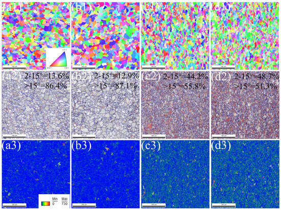 IPF, GB, and GND of experimental steels: (a1–a3) LN 1 °C·s−1; (b1–b3) LN 3 °C·s−1; (c1–c3) HN 1 °C·s−1; (d1–d3) HN 3 °C·s−1.