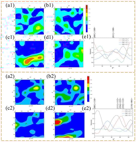 (a1–d1) ODF at φ2 = 0° section. (a1) LN 1 °C·s−1; (b1) LN 3 °C·s−1; (c1) HN 1 °C·s−1; (d1) HN 3 °C·s−1; (e1) η-fiber; (a2–d2) ODF at φ2 = 45° section. (a2) LN 1 °C·s−1; (b2) LN 3 °C·s−1; (c2) HN 1 °C·s−1; (d2) HN 3 °C·s−1; (e2) e-fiber.