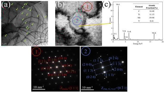 (a) Brightfield phase of precipitate distribution; (b) TEM of precipitates; (c) EDS of precipitates (green arrows point to the precipitates, and (①) and (②) are the SAEDs at the corresponding positions in (b), respectively).