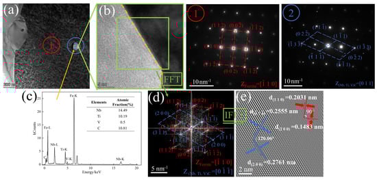 Figure 7a illustrates the distribution of a significant number of precipitated phases on the ferrite matrix, with some of them forming on dislocations. Based on the nucleation theory, dislocations can provide energy for the nucleation of precipitated phases. On the other hand, the formed precipitated phases can pin the movement of dislocations and improve the strength of steel. Figure 7b,c demonstrate that the precipitated phase exhibits a square shape with an approximate size of 50 nm. The main components of the precipitated phase are carbides of Nb, V, and Ti, with Nb content being the highest and V content being the lowest. The SAED in the corresponding region of Figure 6(c1,c2) shows that the matrix of the precipitated phase is ferrite with a crystallographic band axis [111]. The precipitated phase is (Nb, V, Ti)C with crystallographic band axis . Wang et al. [20] showed that there is a certain OR between the precipitated phase and the matrix. The HRTEM of the matrix/precipitate interface and the FFT and IFFT of the corresponding region are shown in Figure 8.
