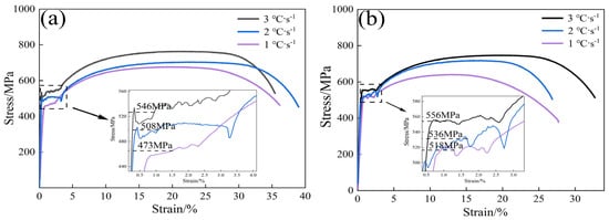 Tensile curves of two Nb-containing steels at different cooling rates: (a) LN; (b) HN.