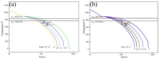 CCT curves of experimental steels: (a) CCT curve of LN steel; (b) CCT curve of HN steel.