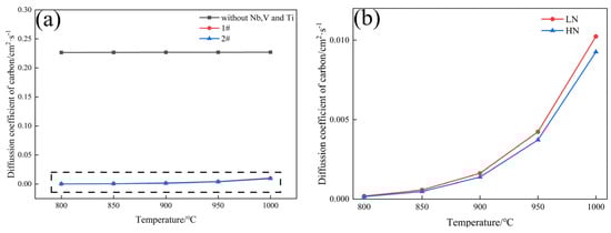 Figure 11 shows that the addition of microalloying elements can significantly reduce the diffusion coefficient of carbon atoms, and with the increase in Nb content, the diffusion coefficient of carbon atoms of HN steel is lower than that of LN steel. Cementite is the main reinforcing phase in pearlite, and increasing the Nb content can reduce the growth rate of cementite and decrease the thickness of cementite. Studies have shown that when the thickness of the cementite is less than 200 nm, the cementite will bend and rotate during stretching rather than break [23].