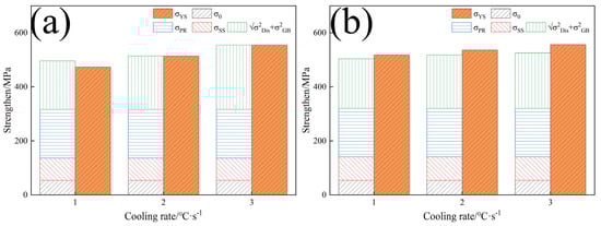 With the increase in Nb content from 0.017 to 0.023 wt.%, the cooling rate increased from 1 °C·s−1 to 3 °C·s−1. The yield strength and tensile strength of LN steel reached 546 MPa and 747 MPa, respectively. The yield strength and tensile strength of HN steel reached 556 MPa and 764 MPa, respectively. The results of the strengthening mechanism show that the vector sum of dislocation strengthening and grain boundary strengthening is closer to the experimental results.