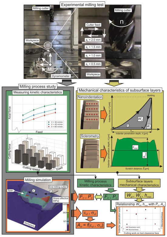 The most common methods of ensuring the required service properties of parts for various machines and mechanisms are various chip formation–cutting processes. As a result of the tool’s thermomechanical impact on the machined workpiece, certain mechanical properties are generated in the workpiece’s subsurface layers [1,2]. These properties, evaluated in terms of the hardness parameters (including microhardness) [3], residual stresses [4,5], material structure [6,7] and others, have a decisive influence on the service properties of machined parts and their durability [8]. The formation patterns of these mechanical properties are essentially determined by the machining process conditions, which in turn are regulated by the used cutting modes. Numerous publications have been devoted to the study of the relationship between the formation regularities of mechanical properties of subsurface layers and the machining process conditions. In the past few decades, this research focus has also been supported by numerical modeling [9]. This significantly expands the possibilities and application area of this research field, as well as providing a significant reduction in the cost of experimental research. In particular, it is relevant in the study of mechanical property generation patterns in subsurface layers of complex-profile parts [10,11] with the use of spatial cutting processes. Spatial cutting processes are characterized by a significant variability in the contact conditions between the tool and the machined material, of which end milling is a striking representative, generating a significant gradient of mechanical properties in the subsurface layers, which is all the more aggravated in the case of hard-to-machine metals and alloys [12]. These circumstances cause significant difficulties both in evaluating the above mechanical properties and in establishing their relationship with the cutting process conditions. Significant support in the evaluation of mechanical characteristics is provided by micro- and nanometer methods, in particular, instrumental nanoindentation [13,14] and the sclerometry (scratching) of surfaces [15,16], ensuring the determination of integral mechanical characteristics, which are quite closely related to the conditions of their generation, in this case, the cutting processes [17].