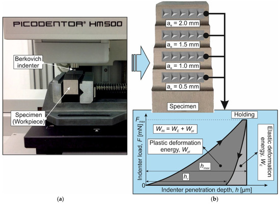 The development of the instrumented nanoindentation method was mainly aimed at determining the microhardness of subsurface layers (see, e.g., [67,68,69]), the deformation degree of variously formed parts (see, e.g., [50,58,70]), the microstructure of materials (see, e.g., [71,72,73]), and the residual stresses in the subsurface layers of specimens generated by their previous formation (see, e.g., [74,75,76]). The determination of the material mechanical properties using the sclerometry method was also used somewhat later to investigate the microstructure and hardening of materials by estimating the indenter penetration depth into the test material (see, e.g., [77,78,79]). Recently, the tool indentation method and the sclerometry method have been used not only to determine the above-mentioned individual mechanical characteristics of the parts’ subsurface layers subjected to various machining processes but also to evaluate the integral (energy) mechanical characteristics [17,80]. In this regard, it is necessary to note the study of Bezyazychnyy et al. [81], devoted to the establishment of the relationship between cutting modes and physical and mechanical characteristics of the machined material, and the specific accumulated strain energy of this material along the workpiece depth. The relationship between the elastic and plastic components, as well as the total indentation energy and microhardness of the investigated specimens was the topic of the study of Yamamoto et al. [82]. The relationship between the mechanical properties of carbide metals and alloys and the cutting process conditions has been studied by Wang and coworkers [83] and Ren and Liu [20].