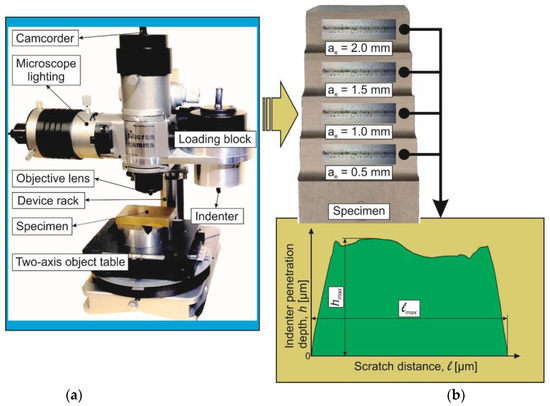 Figure 4. Experimental setup for sclerometry and its measurement scheme: (a) experimental setup for sclerometry of machined surfaces; (b) specimen image and sclerometry diagram.