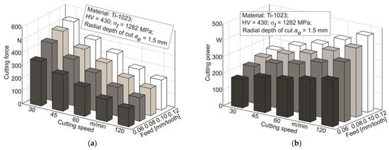 The change in cutting force is explained with a proportional increase in the volume of removed material in chip form. At the same time, increasing the cutting speed leads to a significant reduction in the resultant cutting force—Figure 6a. This effect of cutting speed is explained by the predominant influence of machined material softening over its strain hardening [90,99,100]; in other words, the increase in cutting temperature caused by an increase in cutting speed softens the machined material to a greater extent than this material is hardened due to the speed factor. An increase in cutter feed also causes a corresponding increase in cutting power, as is presented in Figure 6b, due to the increased volume of workpiece material removed. In contrast to the effect on the resulting cutting force, an increase in cutting speed leads to a significant increase in cutting power. In all probability, this is caused by the numerical influence of cutting speed, since the value of cutting speed is included as a multiplier in the dependence of cutting power determination.