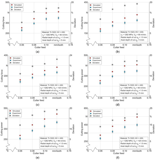 Figure 7. Comparison of experimental and simulated values of the resultant cutting force and cutting power with changing cutting modes: (a) cutting force dependence on cutter feed at cutting speed VC = 60 m/min; (b) cutting force dependence on cutter feed at cutting speed VC = 90 m/min; (c) cutting force dependence on cutter feed at cutting speed VC = 120 m/min; (d) cutting power dependence on cutter feed at cutting speed VC = 60 m/min; (e) cutting power dependence on cutter feed at cutting speed VC = 90 m/min; and (f) cutting power dependence on cutter feed at cutting speed VC = 120 m/min.