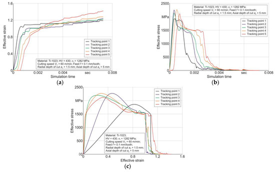 Figure 8. Change in effective stress and effective strain in the region of the tertiary cutting zone: (a) effective strain variation over the simulation time; (b) effective stress variation over the simulation time; (c) relationship between effective stress and effective strain for five tracking points.