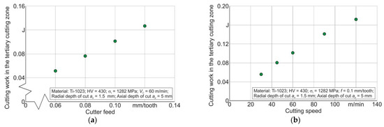 The variation in effective strain εcf and effective stress σcf by simulation time for the considered five tracking points placed in the tertiary cutting zone region is presented in Figure 8a,b. According to the results of the change in εcf and σcf their relationship is determined and presented in Figure 8c. This relationship together with the material volume value Vm removed as a result of the milling, determined for the studied range of cutting modes, was used to calculate the cutting work Acf in the tertiary cutting zone (see Equation (4), Section 3). In this case, the volume Vm was determined from the nominal chip shape, without taking chip compression into account. This assumption was made on the basis that the chip compression ratio of the used Ti-1023 titanium alloy for the studied range of cutting modes does not exceed 1.1 [84,86]. The effect of cutter feed and cutting speed on the cutting work Acf is presented exemplarily for a cutting speed VC = 60 m/min and a radial depth of cut ae = 1.5 mm in Figure 9. The cutting work Acf in the tertiary cutting zone increases almost linearly as the cutter feed increases from 0.06 mm/tooth to 0.12 mm/tooth—Figure 9a. This increase in cutting work seems logical because as the cutter feed rate increases, the amount of material removed per unit of time increases. An increase in cutting speed in the studied range causes a monotonic increase in cutting work AcfFigure 9b. This increase in Acf is most likely also a consequence of the increase in the material removal volume with increasing cutting speed.