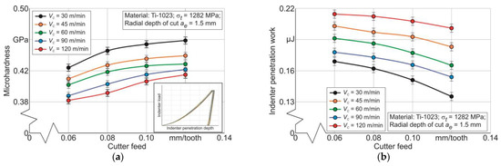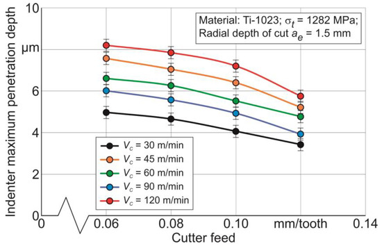 The maximum depth of indenter penetration hmax into the milled surface as a result of sclerometry monotonically decreases with the cutter feed increase. This is due to the increased hardening of the workpiece subsurface layers as a result of machining with increasing cutter feed due to the corresponding increase in the volume of material removed per unit of time [99,100]. As a result of this increase in the hardening of the subsurface layers, the indenter penetration depth at constant load decreases [17]. At the same time, the maximum depth of indenter penetration increases with increasing cutting speed—Figure 11. This effect of cutting speed is a consequence of softening at the workpiece milled subsurface layers [88,89,99], caused by the increase in cutting temperature as a result of increasing cutting speed [89,101].