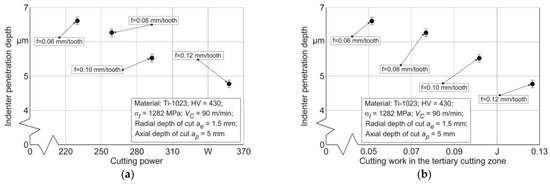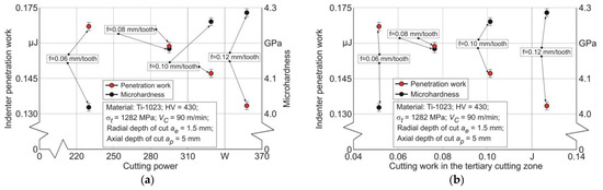 The coincidence results of both mechanical characteristics of the machined subsurface layers, indenter penetration work and microhardness, with cutting power PC and cutting work Acf in the tertiary zone are presented exemplarily for a cutting speed VC = 60 m/min and a radial depth of cut ae = 1.5 in Figure 12.