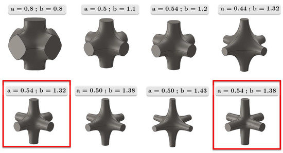Figure 2 shows the unit cell geometries computed for some parameters, a and b; their role is fundamental inasmuch as they modify the mechanical strength-to-weight ratio of the lattice structure.