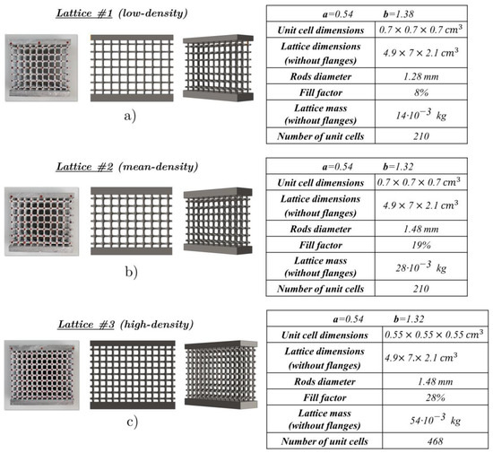 In this work, three types of lattices are examined, and the geometrical characteristics (rod diameters; measurements of height, width and length; the fill factors computed as the ratio between the full volume and the total volume; the numbers of unit cells) are reported in Figure 3. All of the lattices have the same overall sizes. The first lattice (Figure 3a), with the parameters , is characterized by a low density, while the second one (Figure 3b) and the third one (Figure 3c), with the parameters , have medium and high densities, respectively.