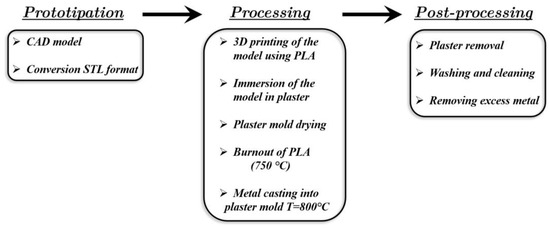 The lost-PLA process is a manufacturing method inspired by an ancient process called “lost wax”, in which PLA (polylactic acid) replaces the wax. The subsequent manufacturing steps, adopted to build up the aluminum (Al) alloy samples, are summarized in the scheme of Figure 4. The starting point is a CAD model, which is converted into STL format in order for it to be processed and printed by a 3D printer. Successively, the PLA sample is immersed in liquid plaster and, after drying, the PLA is removed by burning the sample in an oven at a temperature of up to 750 °C so that the negative shape of the model remains. Clearly, the burn-in process implies that the accuracy of the 3D printing is not a critical parameter. The plaster used here was provided by Omnicast: it is a special plaster employed in metal microcasting and is usually employed in goldsmithing and in metal casting more generally; this plaster is able to stand temperatures of up to 1000 °C.