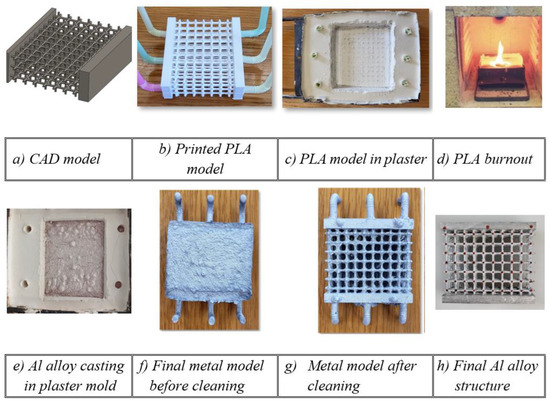 Finally, after the Al alloy casting and solidification, the process requires washing, cleaning and removal of excess metal in order to obtain the final structure. Further details can be found in [51]. A sequential outline of the manufacturing steps is given in Figure 5. The three types of produced samples and their geometrical characteristics are given in Figure 3.