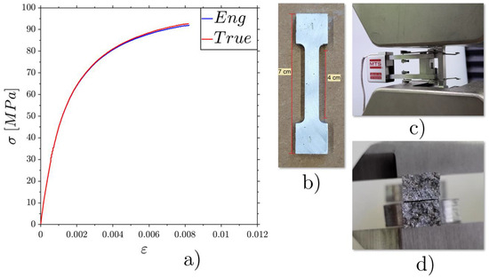 Engineering and true σ-ε curves for the tensile test (a), the dog-bone Al 6082 sample before the tensile test (b), the extensometer (c) and a cross-section view after fracture (d).