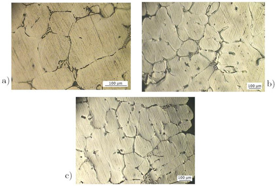 Microstructures of the Al 6082 alloy after the casting process: (a) 200X, (b) 100X and (c) 50X.