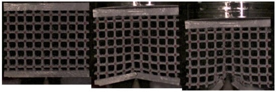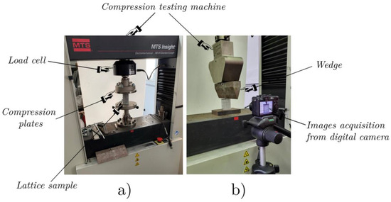 The static flat compression test is a classical test performed on lattice structures to analyze their mechanical response in terms of their overall force–displacement behavior during progressive collapse. The tests were carried out in a compression machine with the adoption of a couple of compression plates (Figure 8a), keeping a constant crosshead speed of 1.25 mm/min during the elastic–plastic compression. The resulting forces were measured by means of the load cell shown in Figure 8a.
