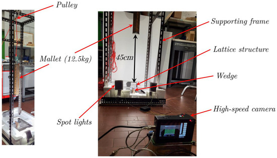 Dynamic compression tests are used to investigate mechanical responses under high strain rates. All impact tests were conducted with a drop-weight system, with a fall height of 450 mm (the mallet weight was 12.5 kg) and a resulting impact speed of about 3 m/sec; the deformation sequences were captured using a high-speed digital camera. The experimental set-up for the dynamic tests is shown in Figure 9.