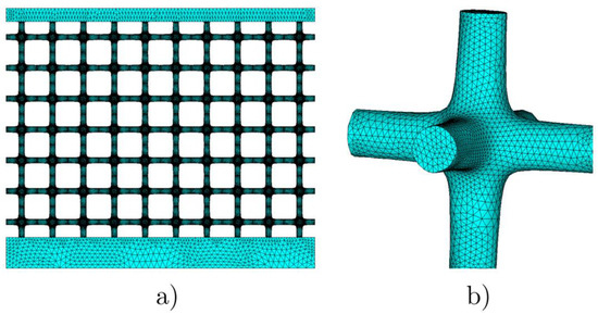 FE mesh of the low-density lattice (a) and detailed mesh of the unit cell (b).