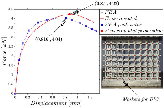 Comparison of the force–displacement response between the experimental test and the FEA for the low-density lattice (Figure 3a).
