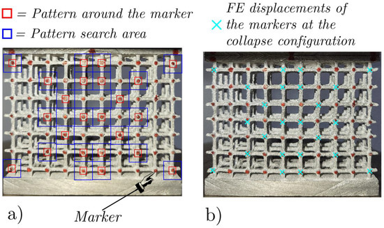 A comparison of the internal displacements among the experiment and FEA is shown in Figure 13, where the DIC is used to follow the displacements of the marked points of the lattice during the loading. In Figure 13a, the red squares denote the designated patterns to be looked for within the blue rectangles in all the pictures in the sequence (85 for the case shown in Figure 13), employing the algorithm described in [53], which leverages cross-correlation. A major difference between the experimental results and the numerical predictions of displacements can be observed along the fourth row of Figure 13b; this deviation arose from some unpredictable internal defects of the specimen which significantly influenced the deformation behavior of the lattice structure. Such factors include internal material defects like microcavities or impurities stemming from the casting process, which make the material’s behavior more brittle than previewed. Conversely, numerical analyses operate with an idealized model, homogeneous at all points—an assumption that does not reflect real complexity. Furthermore, the FE model did not take into account the breakage of the elements that actually occurred during the experiments. However, our aim is to investigate the reliability of the ideal FE model in representing the phenomena under investigation, without taking into account the difficult predictability of sample defects that are generated during their production.