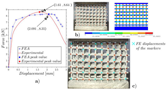 For each experimental test, an FE model that simulated it was generated to assess the reliability of the numerical model with respect to the prediction of the mechanical response and collapse. Experimental and numerical results were compared in terms of force–displacement responses and deformed configurations by means of Digital Image Correlation (DIC).